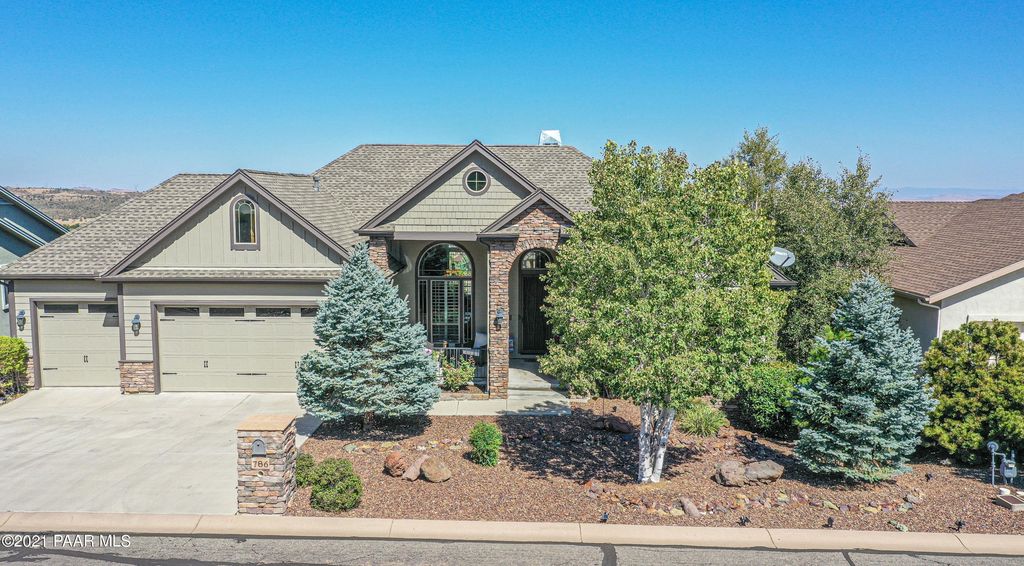 This well appointed home in Prescott Lakes is a true show stopper! Views of Willow Lake, The Dells, Granite Mountain & SF Peaks in Central Prescott w/main level living & 3 CAR GARAGE! Jaw dropping great room w/14ft ceilings. Impressive floor to ceiling stacked stone gas fireplace! Kitchen has gas cooktop, wall oven/microwave. More features include coffered ceiling details, low-e windows & a copper wall feature. Master on main level w/large en-suite including jetted whirlpool tub, step in shower & walk in closet. Gorgeous Formal Dining Room, Office, Laundry Room, 1/2 bath are also on main level. Downstairs features 2 additional bedrooms, full guest bath, game room, kitchenette/wetbar, 2nd living room, temperature controlled wine cellar, zoned AC/Heat & Patio. Also,